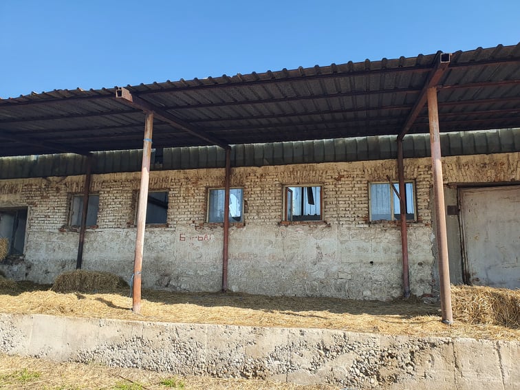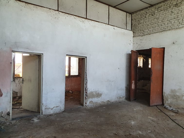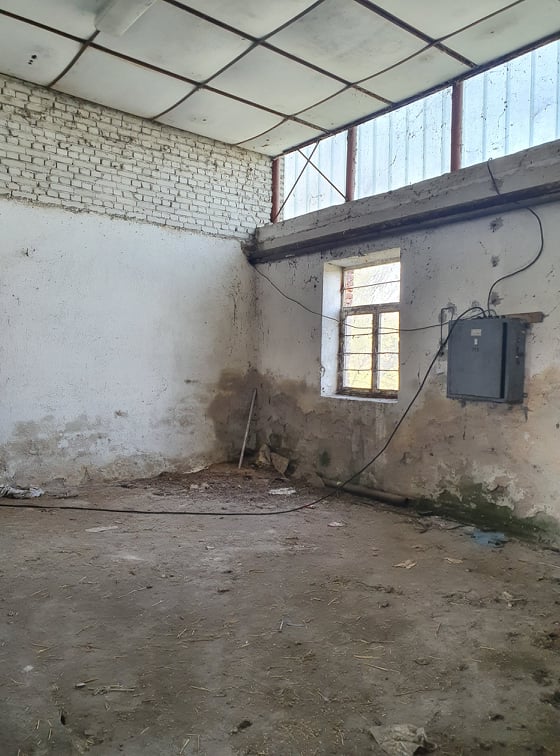 Разделено е на няколко помещения, може да стане и 1 цяло. 4 броя портални врати. Рампа. Санитарен възел. Строителството е от камък и тухла.
