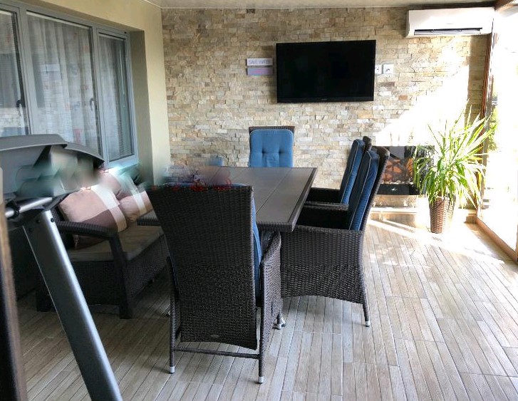 Голяма закрита тераса, оформена като зимна градина с градински мебели, плазмен телевизор и климатик.