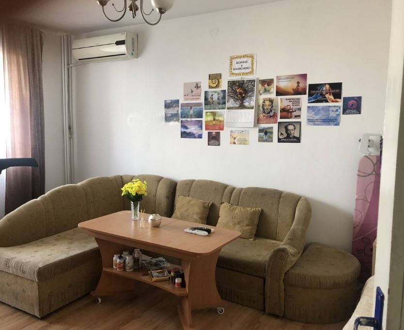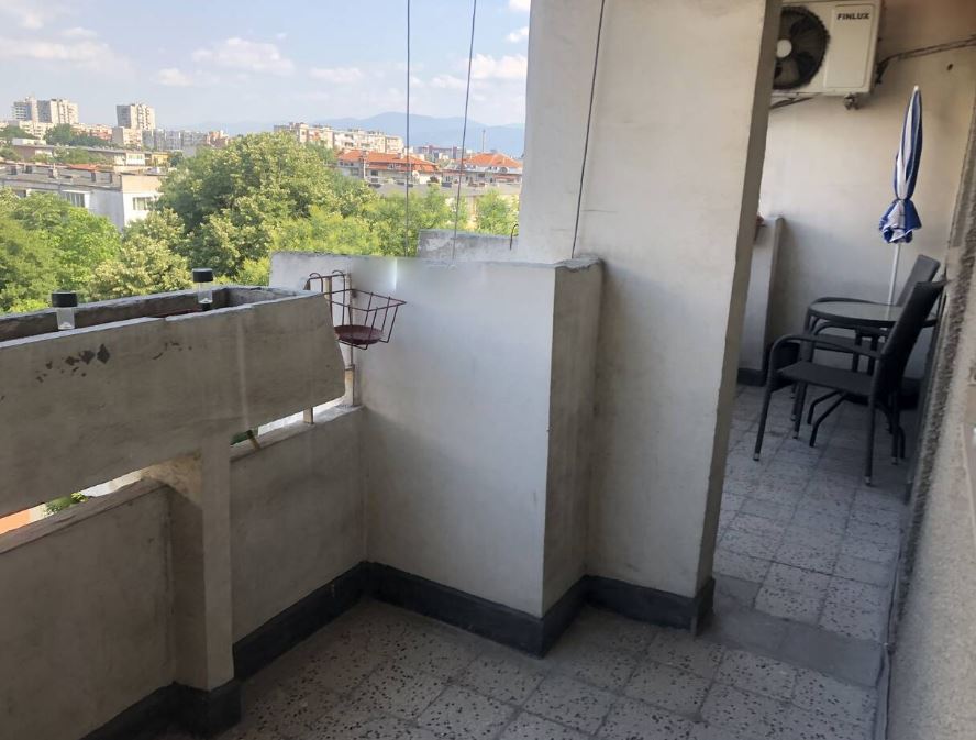 Монолитен апартамент състоящ се от голяма стая и отделна кухня, баня, тоалетна и коридор с вграден гардероб. Жилището е с изложение югоизток на 6 етаж от 8. етажна монолитна сграда с подържан вход и асансьор контролиран достъп. Пред блока има голям безплатен паркинг. Стаите гледат към вътрешен двор с градина, тихо и спокойно място на 5 минути от центъра на града. Апартаментът е със сменена дограма, обзаведено с нова спалня и матрак, климатик, печка с керамичен плот, хладилник и пералня Бош, хубава секция цвят елша. Продава се с цялото обзавеждане.