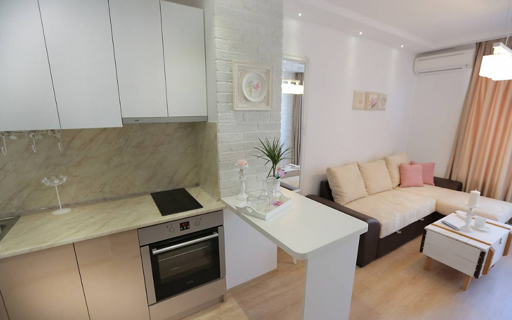 Представлява самостоятелна просторна спалня, хол с трапезария и кухненски бокс, входно антре и баня с тоалетна.
