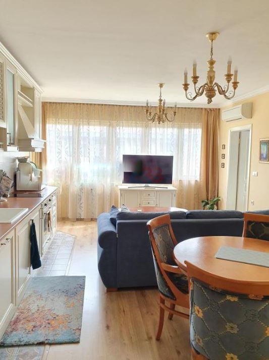 Стар монолитен апартамент след основен ремонт. Сменеи В и К и ел. инсталации, направена е вътрешна изолация. Състои се от три спални, хол, трапезария и кухня. Към имота прилежат таванска стая ( 8кв. м. ) и мазе ( 10 кв. м. ). Има СОТ и застраховка. Всички изложения без запад. Цената е с трайно прикрепените мебели и подобрения: кухня от дърво ( ясен) и вградени висок клас уреди - два хладилника с фризери Либхер, съдомиална, пералня със сушилня, фурна, два керамични котлона, двоен аспиратор с два мотора, четири климатика Дайкин, луксозна баня с тоалетна, външни ролетни щори на терасата, таванската стая е отремонтирана с теракот, мивка и тоалетна, 120л. бойлер със соларен панел и нова дограма. Мазето е на замазка и с нов прозорец. Останалото обзавеждане е проектирано с помощта на дизайнер и може да се закупи за 17000Е. Сградата е с ТЕЦ, домофонна система и добре поддържани общи части. НЯМА АСАНСЬОР. Блокът е с договор за саниране през 2020г. Има два паркинга и паркирането не е проблем. Сградата е без асансьор и се намира в района на УХТ.