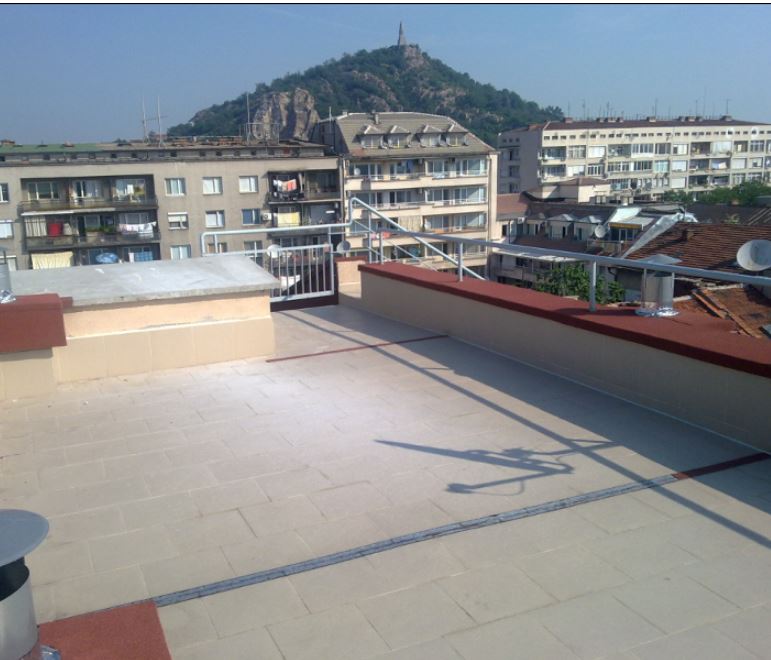 Тераса изток с панорама към две от тепетата и метална стълба към второто ниво на мезонета, което представлява една голяма панорамна тераса с изглед във всички посоки.