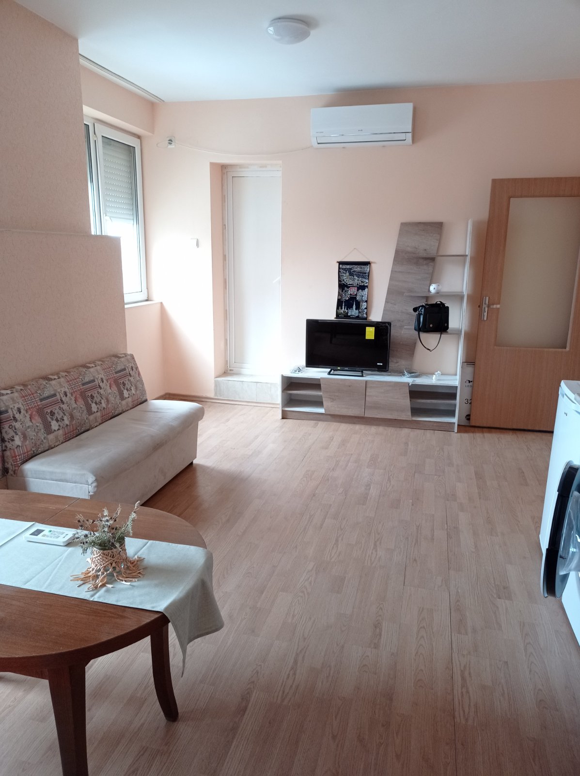 Хол.гарнитура, секция, телевизор. Кухненско обзавеждане с оборудване- готварска печка, аспиратор, хладилник, пералня. Климатик.
