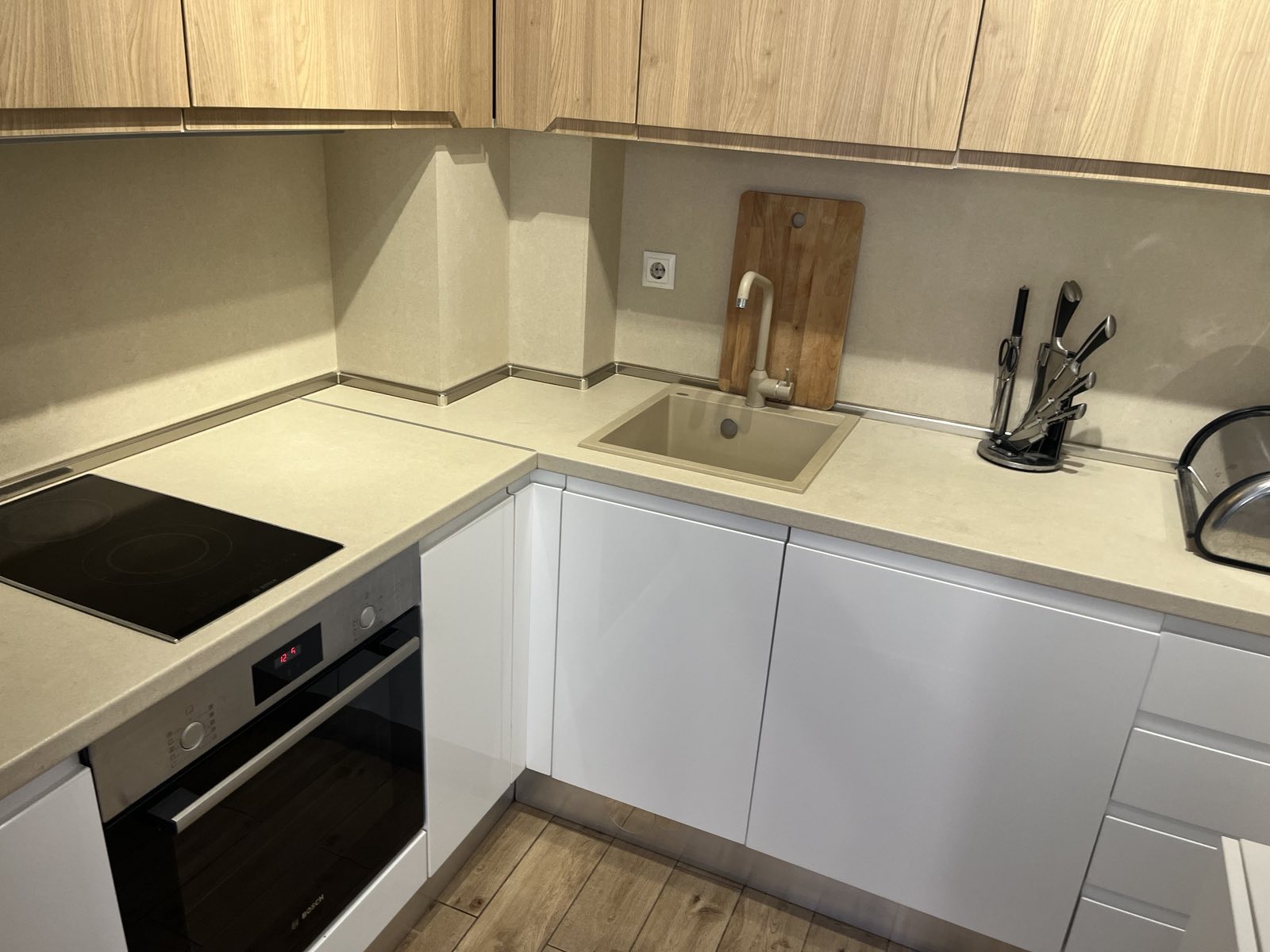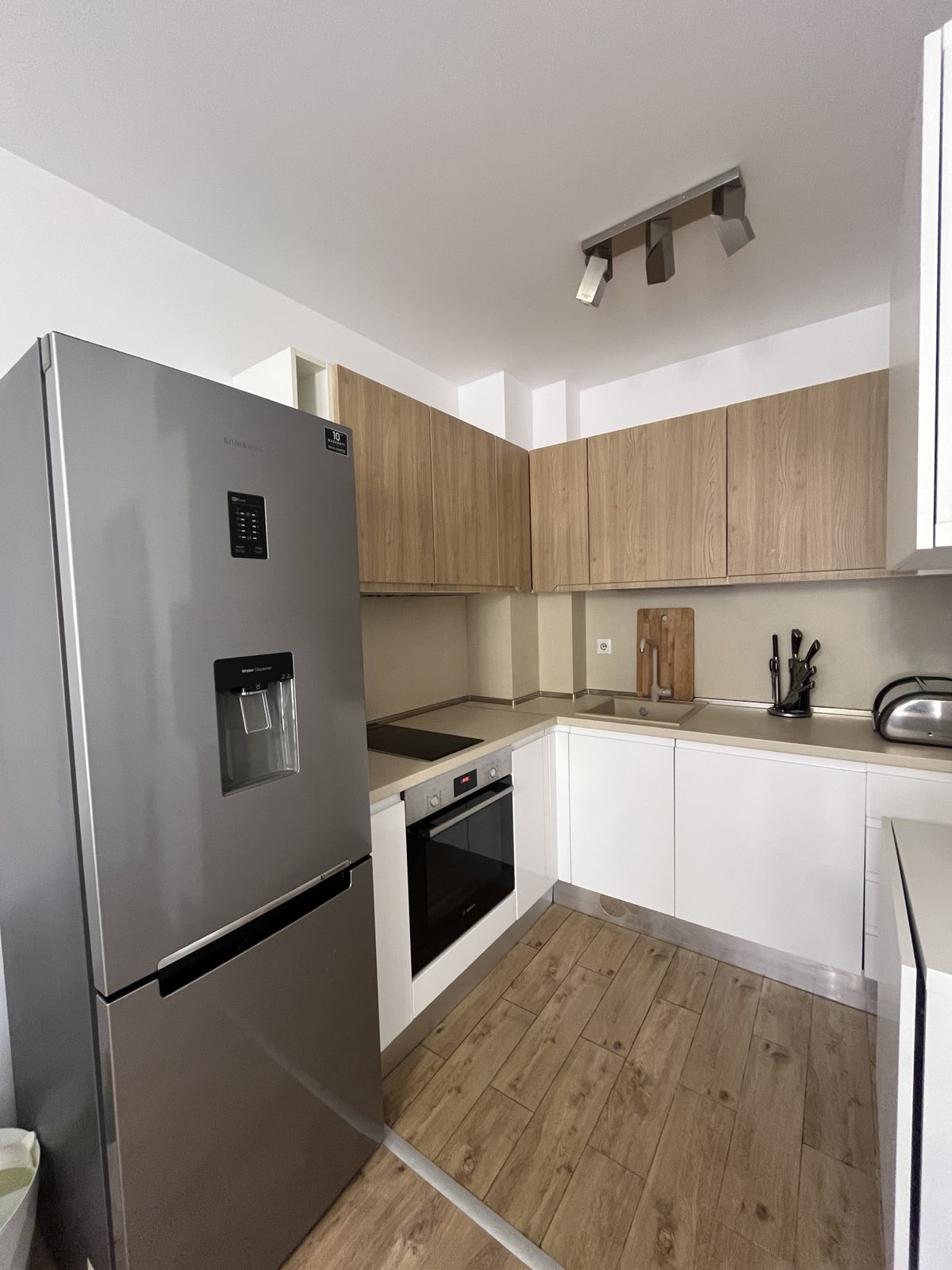 Вградена фурна с котлони, аспиратор. Вградена пералня. Хладилник с диспенсер и фризер.