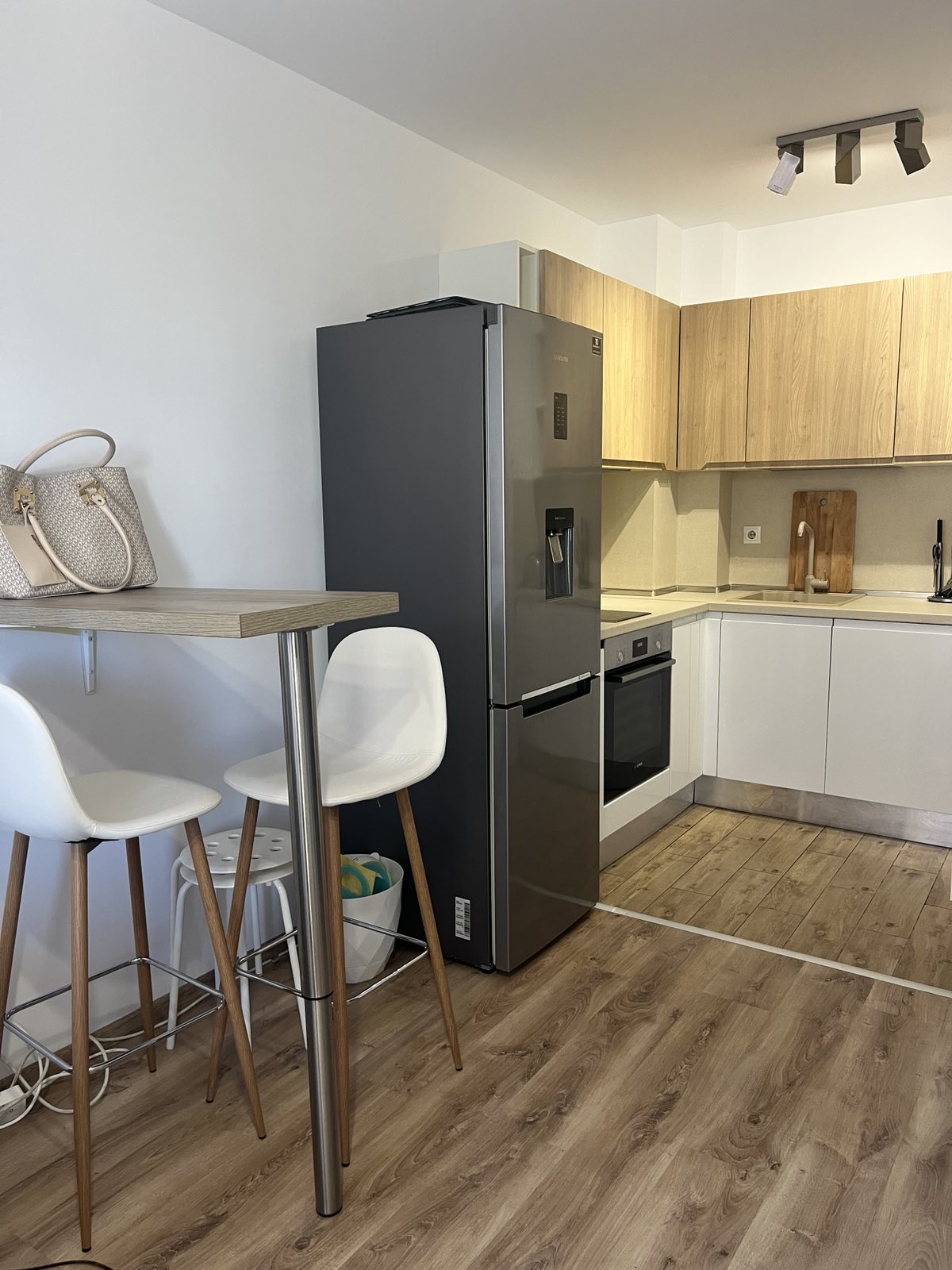 Кухненски шкафове, барплот, високи столове.